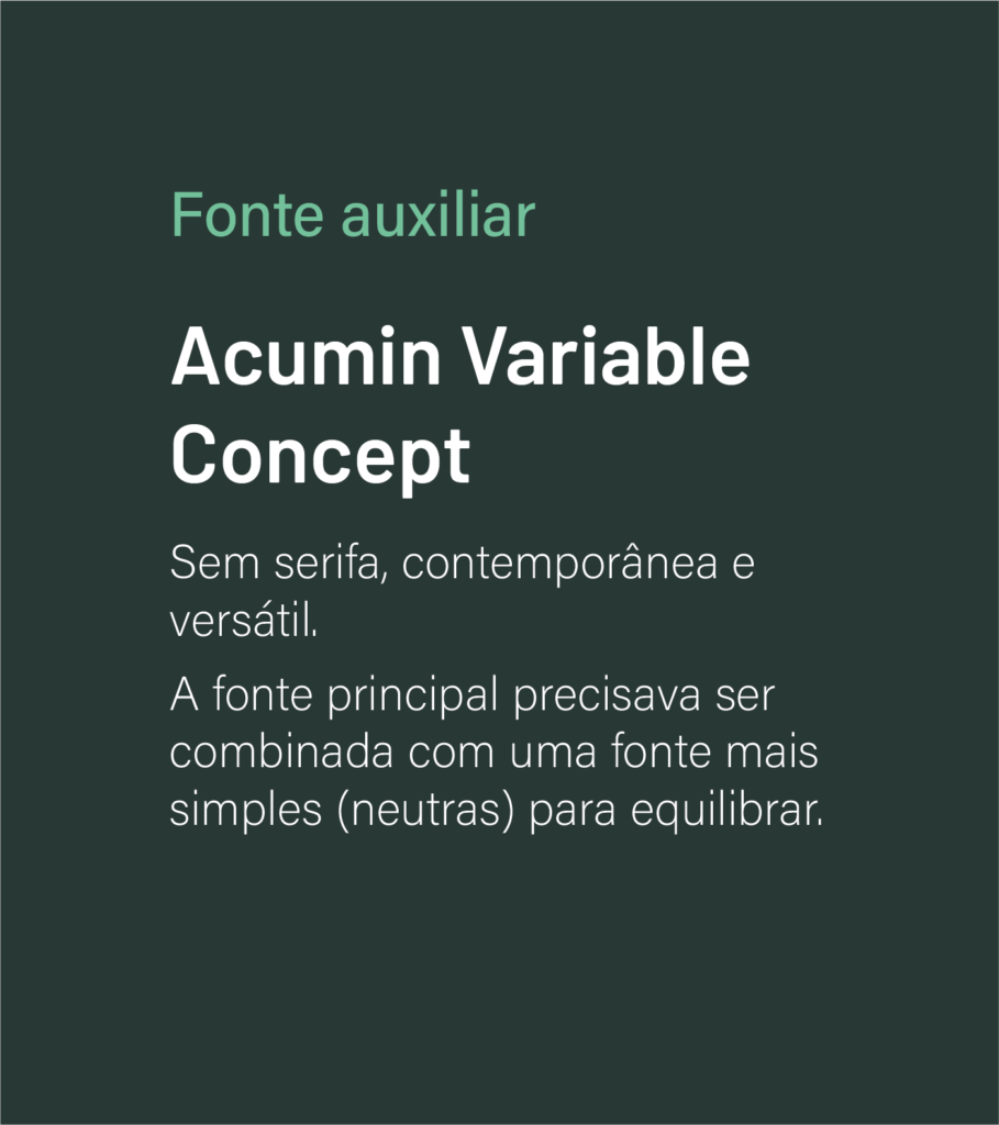 A tipografia utiliza duas fontes complementares: a principal é forte, em caixa alta e com traço manual, reforçando o aspecto humano da marca; a secundária é leve, garantindo equilíbrio visual.